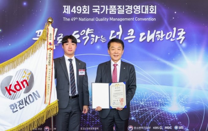 한전KDN(김장현 사장, 오른쪽)이 지난 22일 코엑스 오디토리움홀에서 진행된 ‘제49회 국가품질경영대회’에서